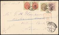 1896. 1c. parstykke samt 5c og 10c/50c på rek.-brev stemplet ST. THOMAS 6/1–1896 sendt til London med ankomststempel på forsiden. Flot kvalitet. [ 5+10+28 ] [ ✉ ]