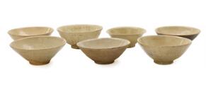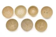 Syv diverse Sydøstasiatiske skåle af glaseret keramik, flere prydede med bladdesign i relief. 15–16. årh. Diam. 15–17 cm. (7)