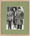 Originalt s/h pressefotografi af den britiske premierminister Winston Churchill (1874–1965) sammen med hustruen, Clementine (1885–1977) og sønnen Randolph (1911–1968) foran hoveddøren til Downing Street 10 i London. Optagelse fra oktober 1940. Bagside med agenturstempel (delvist skjult bag telegram), håndskrevne blyantsnotater, påhæftet nyhedstelegram samt påstemplede datoer for avisoffentliggørelse (24. oktober 1940, 30. december 1940, 31. december 1940). Egetræsramme med dobbeltglas. Lysmål 20×15 cm. Rammemål 29×24 cm.