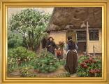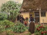 Outside a farmhouse, the neighbour comes to visit. Early summer with flowering fruit tree, tulips, bleeding hearts and peonies. Signed and dated H.A. Brendekilde 25. Oil on canvas. 53 × 72 cm.