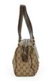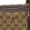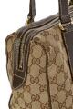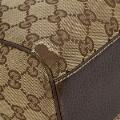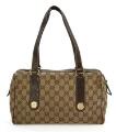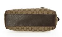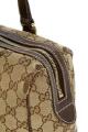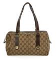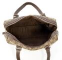 Taske af brunt monogram kanvas med mørkebrune læderbesætninger, gyldne beslag, to hanke, to rum med to indvendige lommer, hvoraf en har lynlås, samt mørkebrunt stof for. H. 19 x B. 29 x D. 10 cm.