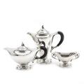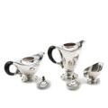 Kaffe- og tekande samt sukkerskål af sterlingsølv, ovale fodstykker med kugler. Kaffe- og tekandens hank af udskåret ibenholt. Georg Jensen efter 1945. Formgivet 1920. Dessin 71 A. Samlet vægt 1390 g. H. 7,2 og 20,5. (4)