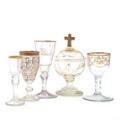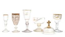 Fire vinglas af krystalglas med forgyldt dekoration samt ciborium af krystalglas dekoreret med forgyldt kristogram og monogram omkranset af grenværk, låg med kors. 18.-19. årh.s slutning. H. 10,8–16. (5)