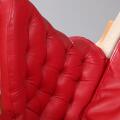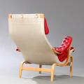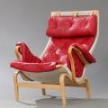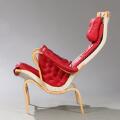 “Pernilla 69”. Lænestol af formbøjet bøg. Sæde og ryg af lys kanvas. Løse hynder i sæde, ryg, nakkehynde samt armlæn betrukket med dybthæftet, rødt skind. Kanter og stropper af naturskind. Udført og stemplet hos Dux.