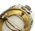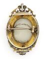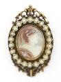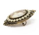 Kamé- og perlebroche af 14–18 kt. guld med nål af 9 kt. guld prydet med kamé udskåret af muslingeskal omkranset af talrige kulturperler. Vægt ca. 6 g. Ca. 2,3×3,5 cm.