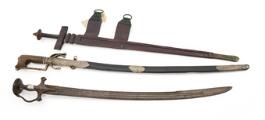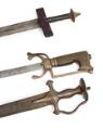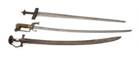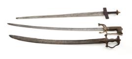 A silver-plated Moroccan Nimcha with an approx. 84 cm. long blade with double hollow grinding on both sides marked with a crescent in a matching? silver-plated leather-covered wooden scabbard, a Tuareg Takouba with a typical leather-covered cruciform grip and an approx. 79.5 cm. long double-edged blade decorated with a double crescent on both sides in a leather scabbard and an Indian Tulwar entirely in iron with an approx. 78 cm. long single-edged blade with three hollow grindings on each side.