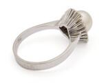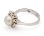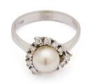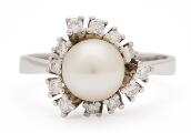 A pearl and diamond ring set with a cultured pearl encircled by numerous brilliant-cut diamonds, mounted in 14k white gold. Weight app. 4 g. W. 13 mm. Pearl diam. app. 7 mm. Size 54.5.