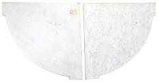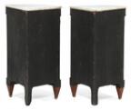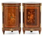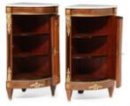 Et par franske hjørneskabe efter model af Paul Sormani, rosentræ indlagt med marquetteri i form af musikinstrumenter og ornamentik, beslag af forgyldt bronze, plader af hvid marmor. Louis XVI form, 19. årh.s anden halvdel. H. 105. B. 63. D. 44. (2)