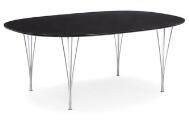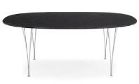 “Superellipse”. Dining table with legs of steel. Top of black lacquered wood. Model B 413. Manufactured and marked by Fritz Hansen. H. 70 cm. L. 180 cm. W. 120 cm.