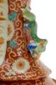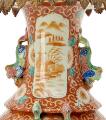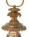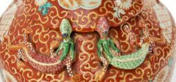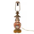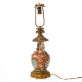 Kinesisk vase af porcelæn, balusterformet, dekoreret med motiver i kartoucher på koralrød bund, hanke modellerede i form af tempelhunde, vasen prydet med påsatte drager; base og lampemontering af forgyldt bronze, ca. 1900. H. ekskl. skærm 49 cm.