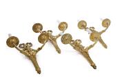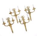 Et sæt på fire væglampetter af forgyldt bronze, hver med to lysarme, Louis XVI stil støbt med sløjfer og bladværk. Ca. 1900. H. 49 cm. (4)