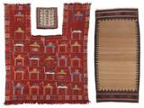 Three Oriental tribal weavings. Verneh cover, Azerbijan/Caucasus. Clasissal design with large animal motifs. 20th/21st century. W. 139 cm. H. 159 cm. Balouch sofreh kilim, Persien. Early 20th century. 76×157 cm. And Luri-Baktiari tribal storage bag. South Persia. 36×36 cm.(3)