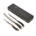 Forskærersæt af metal, skafter af horn med monteringer af sølvplet. Knivsbladet mærket Sheffield. 19. årh. I originalt etui. L. fra 28 til 37 cm. (5)