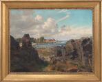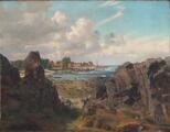 Coastal view with rocks, in the background houses. Signed and dated August Hærning 1917. Oil on canvas. 98.5×129 cm.