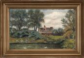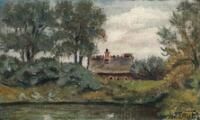 Hus ved skovsø. Signeret Heerup. Olie på plade. 24×40,5.