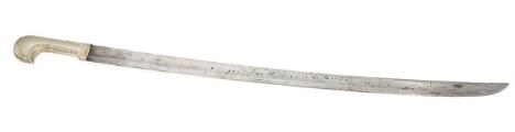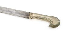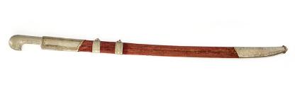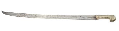 Sølvbeslået russisk schaska i skede med ca. 78 cm. lang enægget klinge med bred hulslibning på begge sider graveret med dobbelthoved ørn under krone i træskede monteret i falmet rødt fløjl med tre sølvbeslag. Greb og beslag præget med bladbort. (1)