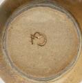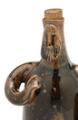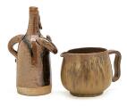A pitcher and a flacon in the shape of a male. Decorated with resp. reddish brown and ochre glaze and olivin glaze. Signed monogram. Pitcher: H. 10.3 cm. L. 15 cm. Flacon: H. incl. cork 20 cm. (2)