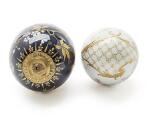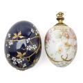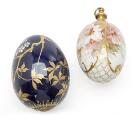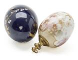 To tyske ægformede flakoner af porcelæn, heraf et dekoreret med bleu-royal glasur, emaljemaling og guld; samt et med blomster i cartoucher. Begge med propper og montering af messing. Königliche Porzellan-Manufaktur i Berlin, 19. årh.s slutning. H. 7–8 cm. (2)