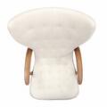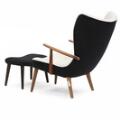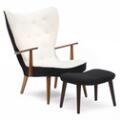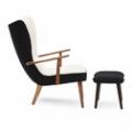 Lænestol samt tilhørende skammel med stel af hhv. teak, bøg og bejdset bøg. Sæde samt dybthæftet ryg betrukket med hhv. sort og lys uld. Udført hos Madsen & Schubell. (2)
