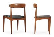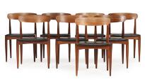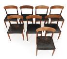 Seks stole med stel af palisander og to stole med stel af teak, betrukket i sæde med hhv. sort patineret skind og skai. Udført og mærket hos Uldum Møbelfabrik. 1960'erne. (8)