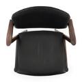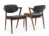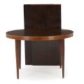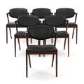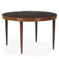 Set of six rosewood armchairs and table with extension and two extra leaves. Seat and back upholstered with black leather. Model 42. Manufactured by Schou Andersen. Table: H. 71,5 cm. Diam./L. 115/225 cm. (9)