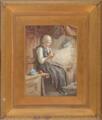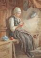 Interor with a young woman knitting. Signed J. E. Goodall 81. Water colour on paper. Visible size 37×34 cm.