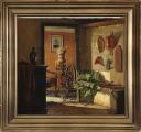 “Køkkeninteriør. Læssø”. Interior from a kitchen on the island Læssø. Signed with monogram. Oil on canvas. 43×47 cm.