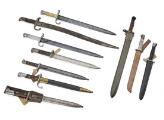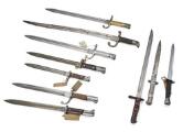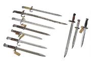 A collection of bayonets consisting of a Danish M/1867 with external spring no. 52473 marked 24 B. 162 on the guard in its scabbard, an American M/1917 bayonet in a fiber scabbard marked US-M1917 B.M. CO. an Argentine M/1891 bayonet with brass grip in the scabbard, a same numbered do with an aluminum grip, a do modified into a trench knife with an approx. 26 cm. long blade in a leather scabbard, two Czech M/1924 bayonets in their scabbards - one with frog, an Austrian M/1895 in its scabbard, a Brazilian M/1908 in a leather scabbard with brass fittings and a Chilean S.I.G. 510–4 bayonet in its scabbard.
