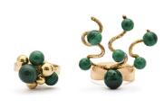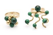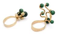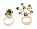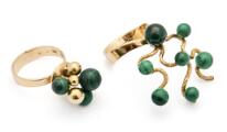 Two malachite rings each set with numerous polished malachite beads, mounted in 14k gold. Weight in total app. 17.5 g. W. 1.7–3.2 cm. Size 55–57. (2)