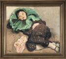 Liggende kvindelig model i prikket dragt og grøn krave. Sign. Carl Fischer. Olie på lærred. 52×60,5 cm.