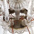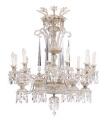 Stor lysekrone af böhmisk glas med kongelig proveniens, seks dobbelt arme med tolv lys monteret til el, prydet med prismer, glasspyd og snoede horn. 19. årh.s anden halvdel. H. 110. Diam. 95.