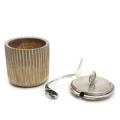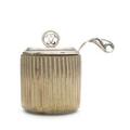 Stoneware jam jar, modelled with vertical grooves. Decorated with light coloured glaze with brownish and green elements. Signed monogram, 129. Silver lid with finial in the shape of a mirror monogram and spoon forged with stylised silver foliage. H. excl. the cover 8. Diam. 8.5 cm.