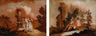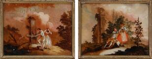 Et par scenerier med en mand og en kvinde ved en vandpost. Usignerede. Hinterglasmaleri. Lysmål hver 18,5×24. (2).