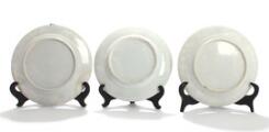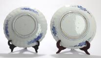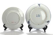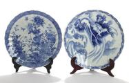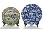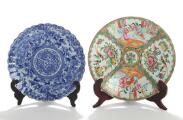 En samling orientalsk porcelæn, bestående af fire fade dekorerede i underglasur blå samt fire større og mindre tallerkener samt fad dekoreret i emaljefarver og guld med figurscenerier og blomster. 19.-20. årh. Diam. 18–41. (9)
