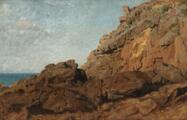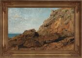 “Klippeparti. Bornholm”. View from a rocky coast on the island of Bornholm. Signed and dated L. T. 75. Oil on canvas. 37×58 cm.