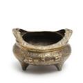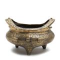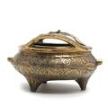 Kinesisk røgelseskar af bronze, rigt støbt og graveret med drager, fisk og bølgeformationer. Vægt ca. 4500 g. Mrk. Xuande, men 20. årh. H. 15,5. Diam. 21.