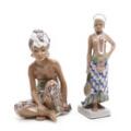 “Bali kvinde” og ”Pige fra det østlige Sierra Leone". To figurer af porcelæn, dekorerede i farver. 1136 og 1117. H. 21.5 og 25 cm. (2)
