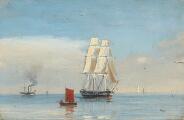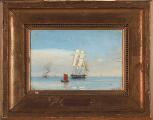Seascape with ships on a quiet sea. Signed Wilhelm M. Oil on cardboard. 17×23 cm.