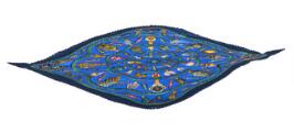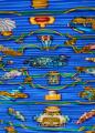 A pleated silk scarf with blue, green and golden motif. L. app. 130 cm.
