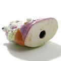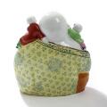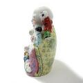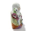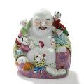 Siddende Budai med kravlende brøn. Orientalsk figur af porcelæn, dekoreret i farver og guld. Stemplet. 20. årh. H. 22.