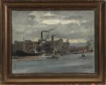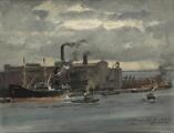 Skibe i Københavns Havn. Sign. V. Qvistorff 1929. Olie på malepap. 27×35 cm.