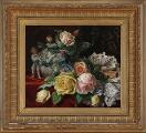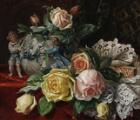 Still life with pink and yellow roses on a red tabecloth. Signed and dated Sophus Petersen 1883. Oil on canvas. 34.5×39.5.