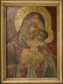 Ikon med fremstilling af Gudsmoder Vladimirskaja. Tempera på træpanel. 18. årh. Antagelig Rusland. 23×16 cm.