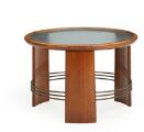 Cirkulært art deco sofabord med plade af matteret glas, stel af mahogni og messing. 1940–50'erne. Udført hos Andr. Tuck. H. 51. Diam. 75.