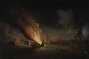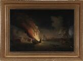 A burning ship in the night, in the backgrund a city. Unsigned. Oil on canvas mounted on board. 49.5×74 cm.