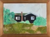 Landskab med sort sommerhus, Bornholm. Signeret Olaf Rude. Olie på lærred. 65×92 cm.