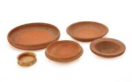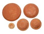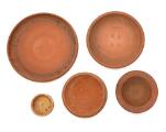“African red slip ware” Four dishes and bowls, three with impressed decoration. Northafrica, 4th-5th century. And a small bowl. Diam. 16–28 cm. H. 3,5–4,5 cm. (5)