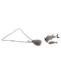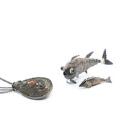 To leddelte fisk af sølv samt flakon af patineret metal prydet med polerede smykkesten. 20. årh. Fisk L. 7 og 14,4. Kæde L. 80. (3)