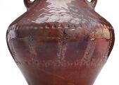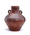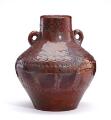 Rund vase af lertøj modelleret med to små hanke og dekoreret med indridset mønsterdekor. Dekoreret med rød lustreglasur. Sign. HAK. Udført hos Kähler. H. 25. Diam. maks. 21.