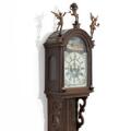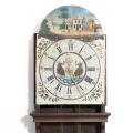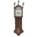 A Frisian wall clock in case of oak, painted dial with figures and city scene, the top of the case adorned with Atlas, flanked by angels of gilt and painted metal. 19th century. H. 147 cm. W. 39 cm. D. 19 cm.